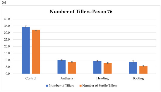 Results from the two trade-off experiments were not significantly different and were combined. In pot experiments, Pavon 76 did not show significant differences between drought treatments and the control for days to booting, days to heading, and days to anthesis, with means of 49.1, 54.3, and 59.1 days, respectively. However, days to maturity showed significant differences between the treatments and the control, with means of 92.8 and 137.5 days, respectively. The total number of tillers was also significantly different between the treatments and the control, with means of 9.3 and 34.3, respectively. The total number of fertile tillers showed significant differences within treatments as well as between treatments and the control. Plants experiencing drought-at-booting had a mean number of 5.5 fertile tillers, those with drought-at-heading and drought-at-anthesis had 8.3 fertile tillers, and the control had 32.2 fertile tillers per plant (Figure 2a). Drought treatments significantly reduced shoot biomass to 11.9 g versus 36.0 g for controls. The root biomass was also significantly affected by the treatments. The means for plants receiving drought at booting, heading, and anthesis were 3.5, 4.9, and 5.1 g, respectively; significantly less than the control at 7.1 g. Grain yields for the drought treatments were significantly lower than for the control, which had a mean grain yield of 51.3 g. Plants receiving drought-at-heading yielded the second highest with a mean of 12.0 g and both the drought-at-booting and drought-at-anthesis treatments yielded the lowest with a mean of 6.3 g (Figure 2b).