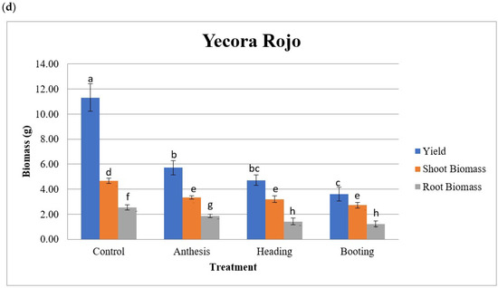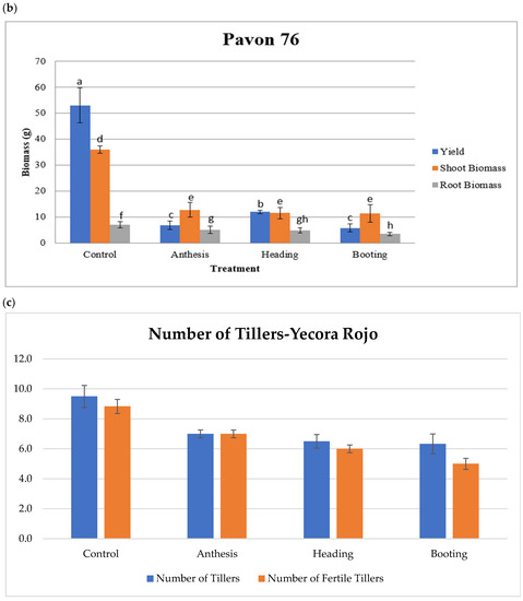 Bar graphs displaying the results for (a,b) Pavon 76 and (c,d) Yecora Rojo from the pot system used in the trade-off experiments. Means followed by different letters within columns are different according to the least significant difference (LSD) test at p ≤ 0.05. Letter designations: a–c: grain yield (Yield), d–e: shoot biomass, f–h: root biomass. Treatments were: drought at anthesis, drought at heading, and drought at booting.