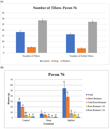 In the tube experiments, Pavon 76 did not show significant differences between the treatments and control for days to booting, days to heading, days to anthesis, or days to maturity with means of 55.1, 60.6, 64.8, and 125.2, respectively. The number of tillers was significantly different within treatments and between the treatments and control. The shallow treatment had the largest number of tillers per plant (28.5), the control was second with 18.3, and the deep treatment had a mean of 5.0 tillers per plant. Of the total number of tillers, 27.3, 16.3, and 4.0 were fertile for the shallow, control, and deep treatments, respectively, with significant differences among all of them (Figure 3a). The shoot biomass also varied significantly among the treatments and the control, with means of 38.2, 20.1, and 5.7 g for the shallow, control, and deep treatment, respectively. Root biomass above 30 cm followed the same trend with means of 6.3, 2.7, and 0.9 g for the shallow, control, and deep treatment, respectively. Root biomass below 30 cm showed no significant difference between the treatments and the control with a mean of 2.1 g (Figure 3b). However, the total root biomass showed significant differences within treatments and between treatments and the control. In the control and the deep treatment, roots reached the bottom of the 1 m tube and, as expected, roots in the shallow treatment did not grow much into the anaerobic volume of sand saturated with water below 50 cm with a mean length of 57.3 cm. Both treatments and the control varied significantly for grain yield with means of 54.1, 29.5, and 7.5 g per plant for the shallow, control, and deep treatments, respectively.