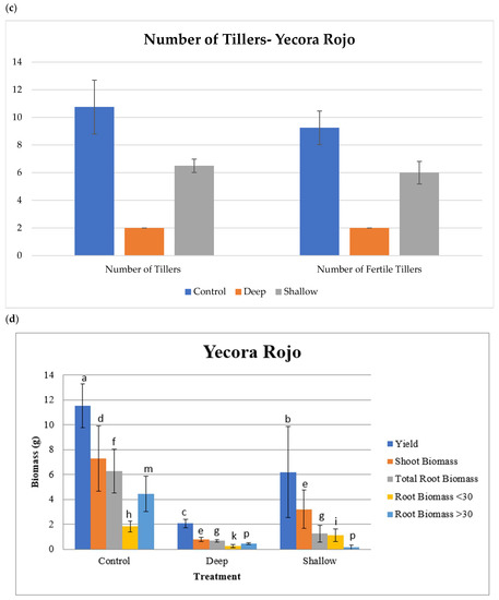 Bar graphs displaying the results for (a,b) Pavon 76 and (c,d) Yecora Rojo from the tube system used in the trade-off experiments. Means followed by different letters within columns are different according to the least significant difference (LSD) test at p ≤ 0.05. Letters are designated alphabetically (each trait given with different letter groups) and note that the groupings were different for Pavon 76 and Yecora Rojo. Yield: grain yield.