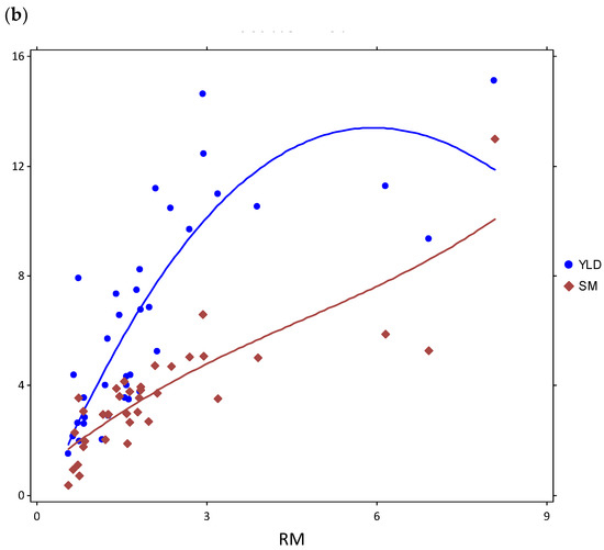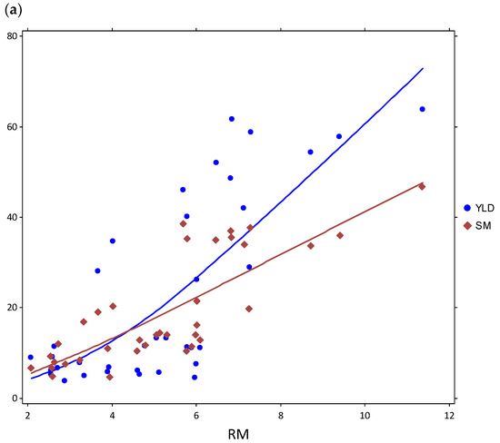 Scatter plots for root biomass (RM) in grams plotted against shoot biomass (SM) and grain yield (YLD) in grams for cultivars (a) Pavon 76 and (b) Yecora Rojo. Data shown are combined from both systems used in the trade-off experiments. Note that scatter plots are on different scales (Loess α = 2.0).