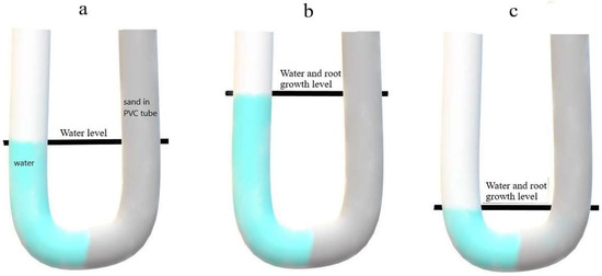 The system devised for the trade-off study consisted of the same PVC tubes as above, but with a much longer plastic sleeve lining extending beyond the bottom of the tube and bent upwards in a U-shape (Figure 5). Water was delivered through that extended sleeve, hence from the bottom up in the tube with sand, and the water level was closely monitored to always be below the maximum reach of the roots, while the capillary upward movement of water in the sand was minimal.
