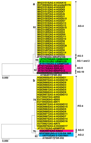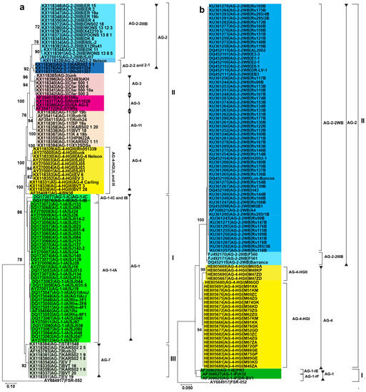Phylogenetic trees of AG sequences associated with soybean and common bean were constructed using the maximum likelihood (ML) method. Only bootstrap values ≥ 70% are shown. Accession number is followed by AGs from the GenBank and isolate name. Different colors show AGs and subgroups and major clades associated with AGs, and these are represented by Roman numerals. (a) Phylogenetic tree of AGs associated with soybean; (b) Phylogenetic tree of AGs associated with the common bean. Scale bar represents genetic distance for horizontal branch lengths. Athelia rolfsii (strain FSR-052) was used as an outgroup.