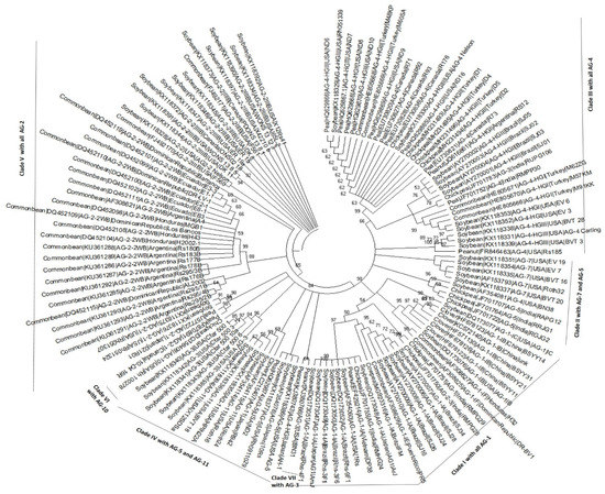 2.2. Phylogenetic Analysis of AGs within Each Legume Crop