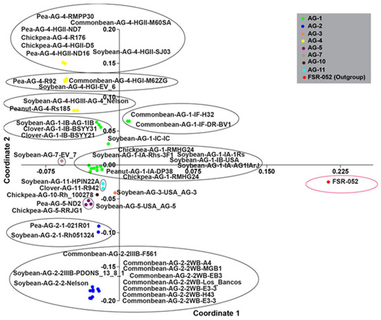 Principal coordinate analysis (PCoA) scatter plot based on the percent sequence identity matrix. Different colors of plots represent different AG groups associated with legume: AG-1 (green circle), AG-2 (blue circle), AG-3 (bisque circle), AG-4 (yellow circle), AG-5 (purple circle), AG-7 (antique white circle), AG-11 (aqua circle), AG-10 (brown circle), and FSR-052 (outgroup—red circle).
