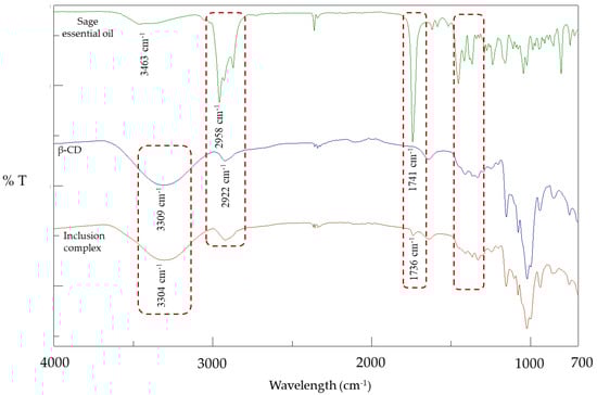 FT−IR spectra of sage essential oil, β-cyclodextrin (β-CD) and inclusion complex (the most characteristic peaks are noted); T: transmittance.