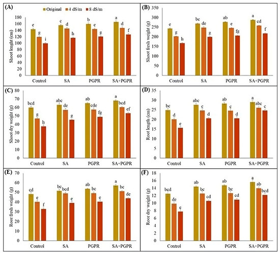 Effect of combined application of PGPR and SA on (A) shoot length (cm), (B) shoot fresh weight (g), (C) shoot dry weight (g), (D) root length (cm), (E) root fresh weight (g), and (F) root dry weight (g) of maize under saline conditions. Error bars show the standard deviation from three independent replications. Variations in lowercase show significant difference between PGPR and SA treatments at p ≤ 0.05. SA: salicylic acid; PGPR: salt-tolerant rhizobacterial strain; SA + PGPR: combination.