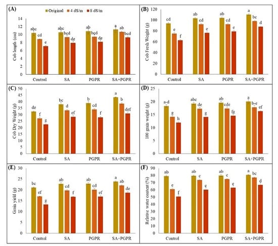 Effect of combined application of PGPR and SA on (A) cob length (cm), (B) cob fresh weight (g), (C) cob dry weight (g), (D) 100 grain weight (g), (E) grain yield (g), and (F) relative water content (%) of maize under saline conditions. The error bars show the standard deviation from three independent replications. Variations in lowercase show significant difference between PGPR and SA treatments at the p ≤ 0.05. SA: salicylic acid; PGPR: salt-tolerant rhizobacterial strain; SA + PGPR: combination.
