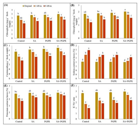 Figure 3 illustrates the effect of NaCl-induced salt stress on photosynthetic pigments and ionic content of treated and untreated maize. It was observed that PGPR, SA and their combination enhanced the chlorophyll a, b and carotenoid contents under both normal and saline conditions. At 8 dS m−1, highest increase in chlorophyll a content was observed in the treatment, where PGPR and SA were used together (25%) as compared to sole applications of PGPR (18%) and SA (15%). Similarly, compared to respective control at 8 dS m−1 salinity, combined treatment of PGPR and SA increased chlorophyll b by 127% than PGPR (20%) and SA (17%) alone. Similar trends were observed in case of carotenoids with a maximum increase of 30% due to combined application of PGPR and SA than respective control at 8 dS m−1 salinity level (Figure 3A–C).