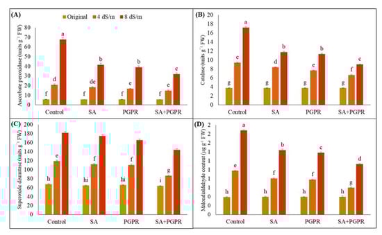 Effect of combined application of PGPR and SA on (A) ascorbate peroxidase (units g−1 FW), (B) catalase (units g−1 FW), (C) superoxide dismutase (units g−1 FW), and (D) malondialdehyde content (µg g−1 FW) of maize under saline conditions. The error bars show the standard deviation from three independent replications. Variations in lowercase show statistical significance between PGPR and SA treatments at the p ≤ 0.05. SA: salicylic acid; PGPR: salt-tolerant rhizobacterial strain; SA + PGPR: combination.