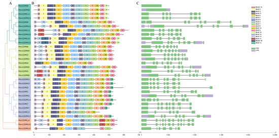 Phylogenetic relationship, motif and structure of PmCDPK and PmvCDPK genes. (A) Phylogenetic tree analysis of 14 PmCDPK and 17 PmvCDPK members. (B) Schematic diagram of the conserved motifs of PmCDPK and PmvCDPK. Each motif is presented by a particular color. (C) Exon-intron distributions of PmCDPK and PmvCDPK genes. Exons are indicated by boxes. Black lines indicate an intron.