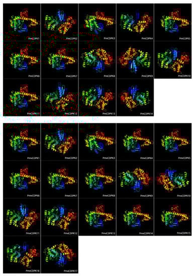 The sequences of 34 AtCDPKs and 31 OsCDPKs were searched from the Arabidopsis Information Resource (TAIR, https://www.arabidopsis.org, accessed on 25 September 2022) and the rice genome annotation database (http://rice.uga.edu/, accessed on 28 September 2022). Theses initial sequences was used as query sequences to identify candidate CDPK genes by using the local library software BLAST-P [66] with an E-value of 1 × 10−7. Then, all non redundant sequences were verified the sequence by HMMER software (version 3.0, http://hmmer.org/, accessed on 30 September 2022) and the E-value was set up less than 1 × 10−7. Finally, NCBI-CDD database (https://www.ncbi.nlm.nih.gov/cdd, accessed on 2 October 2022) and SMART database (http://www.smart.embl-heidelberg.de/, accessed on 10 October 2022) was used to scan and delete the proteins without domains. ExPASy (https://www.expasy.org/, accessed on 15 October 2022) were used to predict the MW, PI and the N-terminal myristoylation sites of PmCDPKs and PmvCDPKs. GPS-Palm (http://gpspalm.biocuckoo.cn/, accessed on 17 October 2022) and WoLF PSORT (https://wolfpsort.hgc.jp/, accessed on 23 October 2022) was used to predict palmitoylation sites and subcellular localization, respectively [48]. The 3D structures of all PmCDPK and PmvCDPK proteins were predicted by homology modeling using the PHYRE2 web portal (http://www.sbg.bio.ic.ac.uk/phyre2, accessed on 28 October 2022). PHYRE2 uses advanced remote homology detection methods to construct 3D models of protein sequences, with a single highest score template model for all proteins and 100% model confidence.