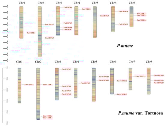 Chromosomal location with gene density analyses revealed that 14 PmCDPK and 17 PmvCDPK genes were unevenly distributed across chromosomes (Figure 4). In P. mume, CDPK genes were distributed on only seven chromosomes. Chr1, Chr4, Chr5 each carried one CDPK gene, Chr2 and Chr6 possessed two genes each, whereas Chr8 and Chr3 possessed three and four genes, respectively. In P. mume var. Tortuosa, 17 CDPK genes were distributed on only 8 chromosomes. Chr1, Chr4, Chr7 each carried one CDPK gene, Chr5 and Chr6 possessed two genes each and three genes were mapped on Chr2 and Chr8, respectively. Four CDPKs were located on Chr3.
