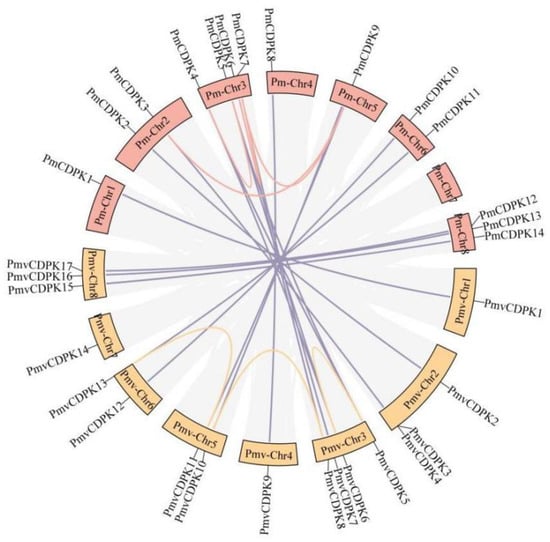 Syntenic relationships among PmCDPK and PmvCDPK genes. Red and yellow curves mean the synteny relationship of CDPK genes in the P. mume and P. mume var. Tortuosa genomes, respectively. Violet curves mean the synteny relationship among PmCDPK and PmvCDPK genes.