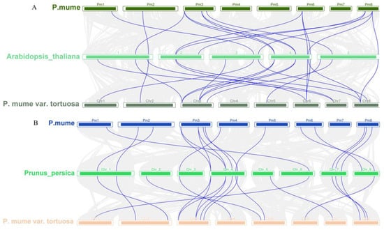To examine the expansion patterns of the CDPK gene family, we analyzed the duplicated events within the P. mume and P. mume var. Tortuosa genomes (Figure 5). We identified 4 gene pairs of CDPKs derived from segmental gene duplications in P. mume (PmCDPK3/PmCDPK9, PmCDPK4/PmCDPK5, PmCDPK6/PmCDPK7 and PmCDPK7/PmCDPK9) and 3 pairs in P. mume var. Tortuosa (PmvCDPK5/PmvCDPK6, PmvCDPK8/PmvCDPK10, PmvCDPK11/PmvCDPK13), but did not find tandem duplication events. Surprisingly, 17 pairs of collinearity relationships between PmCDPKs and PmvCDPKs were detected. There was a high collinearity relationship among most of the P. mume and P. mume var. Tortuosa chromosomes, suggesting that most of the CDPK genes in both species had a similar origin and evolutionary process. To further explore the specific retention of PmCDPK and PmvCDPK genes, their collinearity analyses included AtCDPKs, PpCDPKs, MdCDPKs and RcCDPKs were performed using the MCScanX. (Figure 6, Table S4). A synteny of 16 P. mume chromosomes with A. thaliana while 19 of P. mume var. Tortuosa chromosomes with A. thaliana. Similarly, 16 pairs of homologous genes between P. mume and P. persica, while 17 between P. mume var. Tortuosa and P. persica. A total of 21 and 25 homologous genes pairs were found between M. domestica and P. mume and P. mume var. Tortuosa, respectively. 12 gene pairs were detected in P. mume and R. chinensis. The result was the same in P. mume var. Tortuosa. The collinear complexity of P. mume and P. mume var. Tortuosa with M. domestica was much higher than that other species, indicating that P. mume and P. mume var. Tortuosa was more closely related to M. domestica.