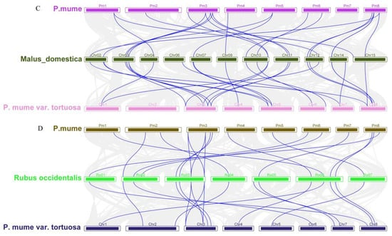 Collinearity analysis of CDPKs in different genomes (A) P. mume vs. A. thaliana vs. P. mume var. Tortuosa (B) P. mume vs. P. persica vs. P. mume var. Tortuosa (C) P. mume vs. M. domestica vs. P. mume var. Tortuosa (D) P. mume vs. R. chinensis vs. P. mume var. Tortuosa.