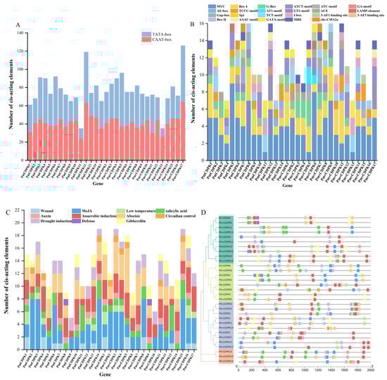 Cis-acting regulatory elements analysis. (A) The number of CAAT-box and TATA-box of the PmCDPK and PmvCDPK genes. (B) The number of photoresponsive functional elements in the promoters of the PmCDPK and PmvCDPK genes. (C) The number of stress-related cis elements in the promoters of the PmCDPK and PmvCDPK genes. (D) Phylogenetic tree analysis of 14 PmCDPK and 17 PmvCDPK members (right). The location of stress-related cis elements in the promoters of the PmCDPK and PmvCDPK genes (left).