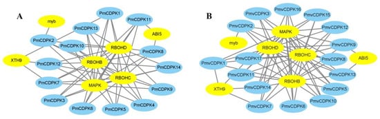 Protein-protein interaction network of PmCDPKs (A) and PmvCDPKs (B).