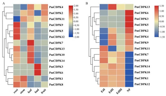As illustrated in Figure 9A, all the PmCDPKs genes were differentially expressed in flower buds, fruits, leaves, roots and stems. Among them, PmCDPK5/9/12 were expressed in roots, PmCDPK7 showed higher expression levels in leaves, PmCDPK3/6 presented relatively higher expression levels in bud, but their expression levels were low in other tissues. All PmCDPKs were expressed during the flower bud dormancy period and also at specific stages of development (Figure 9A, Table S6). Six genes (PmCDPK1/7/8/10/12/14) showed the high level of expression from EDI to EDIII, then abruptly decreased in the NF stage. The expressions of six genes (PmCDPK2/3/4/5/6/9) were exhibited specifically high level in the NF stage. PmCDPK11 and PmCDPK13 showed the highest level of expression in the EDI and EDII, respectively (Figure 9B, Table S7).
