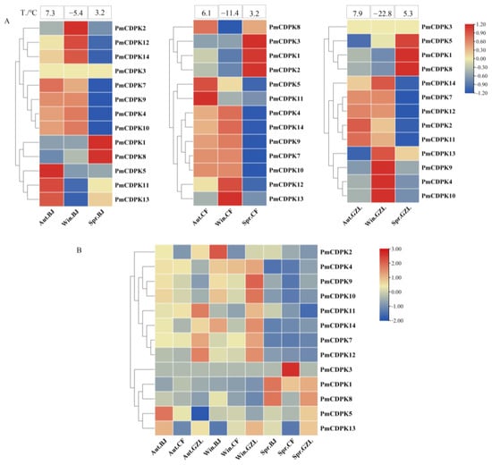 Expression profiles in stems of cold-insensitive cultivar ‘Songchun’ were analyzed under three low temperatures at three test sites: Beijing (BJ), Chifeng (CF), and Gongzhuling (GZL) (Figure 10, Table S8). The expression of PmCDPK6 was not detected and PmCDPK3 expression was low in RNA-seq. At the Beijing site, a total of seven genes (PmCDPK2/12/14/7/9/4/10) showed up-regulation in autumn (7.3 °C) and winter (−5.4 °C) but then decreased in spring (3.2 °C). PmCDPK1 and PmCDPK8 showed higher expression in spring, the expression of PmCDPK5, PmCDPK11 and PmCDPK13 was up-regulated in autumn but down-regulated in winter and spring. The results showed that the gene expression trends at CZL and CF sites were relatively consistent with that in BJ. In general, PmCDPK12/14/7/9/4/10 genes were up-regulated in autumn and winter, then down-regulated in the early-spring in three sites, while PmCDPK1 and PmCDPK8 expression showed the opposite trend, the expression levels of the PmCDPK2/5/11/13 genes showed different trends with the different test sites, indicating that the expression patterns of these genes were different in response to low temperature (Figure 10A). As shown in Figure 10B, for the same season, the expression of most PmCDPKs at different test sites was slightly different, among which PmCDPK3 was highly expressed at Chifeng site in spring, while PmCDPK9 was highly expressed at GZL site in winter. More than a half of PmCDPKs genes showed a relatively low expression in expression in spring, while PmCDPK1 and PmCDPK8 was highly expressed at Beijing site in spring.