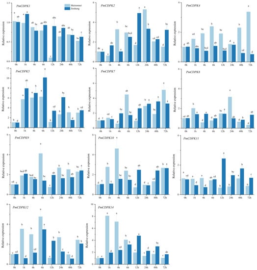 qRT-PCR analysis of PmCDPKs in annual branch of cold-tolerant cultivar ‘Meirenmei’ and cold-sensitive cultivar ‘Jinsheng’ under cold treatment. Data depict mean and standard deviation of three replicates (n = 3). Different letters denote significance at p < 0.05 using Duncan’s multiple range test.