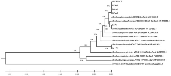 79]. The St 1T2 strain was isolated as an endophyte from potato tuber, E1Pv strain from bean roots, while BPVs2, BAHs1, and BTAs3 strains were isolated from the seeds of beans, peanuts, and wheat kernels, respectively. In previous studies, these endophytic bacteria have been identified based on the Biolog technique as belonging to