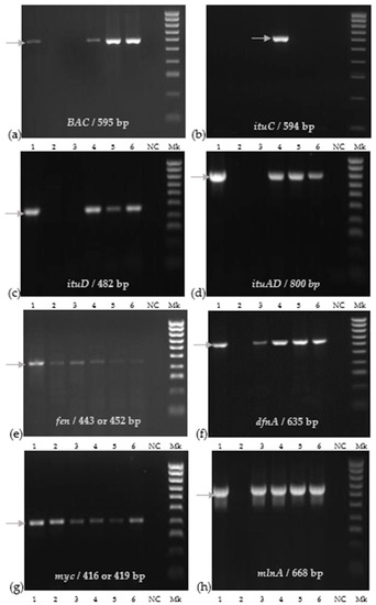 Target genes encoding antifungal compounds (such as bacillibactin, difficidin, fengycin, iturins, macrolactin, and mycosubtilin) were detected via PCR using specific primers (