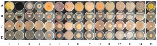 The antifungal activity of the bacterial VOCs was also evaluated via the inverted Petri dish assay. For this test, 200 µL of fresh bacterial culture, with an OD of 0.3 at 600 nm, was spread on LB agar using sterile cotton inoculating swabs. Fungi were inoculated in the center of a PDA plate, as mycelial plugs of 6 mm diameter or as 6 µL spore suspension (104 conidia/mL). These two types of inoculated plates, one with bacteria and the other with fungi, were placed together, and tightly sealed with parafilm foil. Control plates for each tested fungus were also prepared. The incubation was performed at 25 °C. The antifungal activity of VOCs was determined as in the previous test.