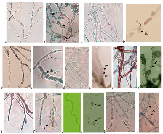 The antifungal effect of the tested bacterial strains was also observed via optical microscopy analysis. Direct microbial interactions were analyzed using the Nikon Eclipse 2000 LED MV R optical microscope (Nikon Corporation, Tokyo, Japan). Lactophenol cotton blue staining was applied to highlight the un-pigmented mycelia.