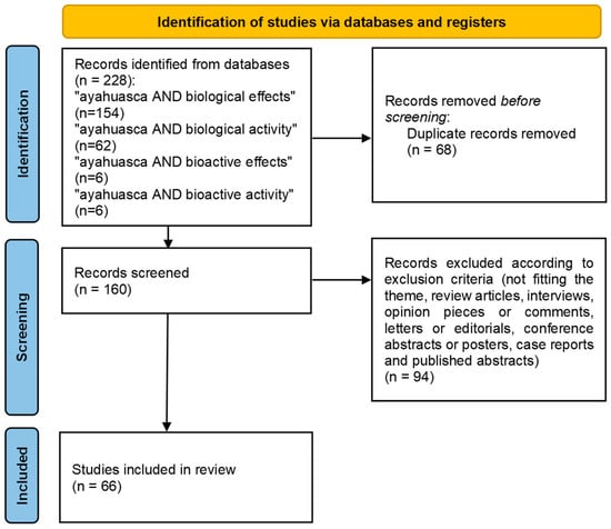 Electronic searches were performed in PubMed (up to December 2022). The following keywords were used: “ayahuasca AND biological effects”; “ayahuasca AND biological activity”; “ayahuasca AND bioactive effects” and “ayahuasca AND bioactive activity”.