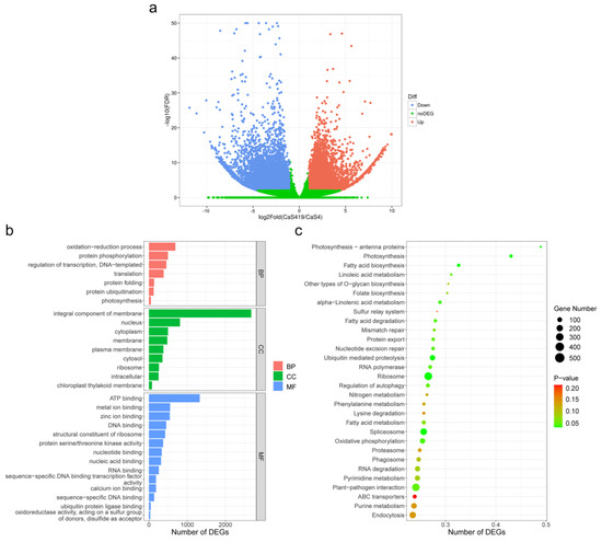 (a) Expression patterns of differentially expressed genes (DEGs) identified between ‘QianFu 4’ triploid tea and ‘Qianmei 419’ diploid tea. Red(16,459 single genes) and blue(7354 genes) dots represent DEGs, while green dots indicate genes that were not differentially expressed. (b) GO enrichment results of DEGs. Red represents a biological process, blue represents the cellular component and cyan represents molecular function. (c) KEGG enrichment results of DEGs.