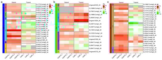 The transport of metal ions in plants is critical to the degree of metal enrichment in different plant tissues [41], and metal transporters are responsible for metal transport between plant tissues. For example, the heavy-metal ATPase (HMA) family plays an important role in transition metal transport in plants [54]. Moreover, in 2010, Mills found that Arabidopsis AtHMA4 can transport Cd2+ [55]. Some transcription factors are also involved in the transcription of metal ions. For example, STOP plays a critical role in tolerance of major stress factors in acid soils, such as proton H+ and aluminum ion Al3+, which are required for the expression of genes in response to acidic stress (e.g., ALMT1 and MATE) and Al-activated citrate exudation [56,57,58]. Therefore, we counted the DEGs expressed in some metal transporters and transcription factors (Figure 4). Among them, 25 DEGs related to Cd transport were identified (CL1775.Contig2_All, CL4038.Contig2_All, CL3769.Contig6_All, CL4653.Contig1_All, CL3134.Contig5_All, CL6452.Contig7_All, etc.), of which 22 DEGs were downregulated in ‘Qianfu 4’ and 3 DEGs were upregulated in ‘Qianfu 4’. In addition, 16 DEGs related to Cu transport were identified (Unigene42320_All, CL18886.Contig2_All, CL19866.Contig2_All, etc.), of which 6 DEGs were downregulated in ‘Qianfu 4’ and 10 DEGs were upregulated in ‘Qianfu 4’. In addition, 24 DEGs related to Al transport were identified (CL10687.Contig2_All, CL11478.Contig3_All, CL10157.Contig1_All, etc.), of which 22 DEGs were downregulated in ‘Qianfu 4’ and 2 DEGs were upregulated in ‘Qianfu 4’. This indicates that most of the genes related to Cd and Al transport are downregulated in ‘Qianfu 4’, reducing the content of Cd and Al transported to leaves in triploid roots, while the number of genes related to Cu transport is upregulated in ‘Qianfu 4’. Moreover, this may be the reason why the Cu content in triploid leaves is higher than that in the ‘Qianmei 419’ leaves.