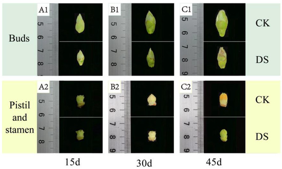 Development of C. oleifera flower buds under different drought stresses. (A1,A2) On the 15th day of treatment, the buds and stamens of C. oleifera under drought stress and in the control group; (B1,B2) On the 30th day of treatment, the buds and stamens of C. oleifera under drought stress and in the control group; (C1,C2) On the 45th day of treatment, the buds and stamens of C. oleifera under drought stress and in the control group.