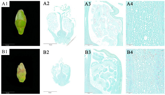 Effects of drought stress on the anatomical structure of C. oleifera flower buds. (A1–A3) the development of the whole flower bud and stamen group of C. oleifera in the control group on the 45th day of drought stress; (B1–B3) the development of the whole flower bud and stamen group of C. oleifera in the treatment group on the 45th day of drought stress; (A4,B4) effects of drought stress on the shape, size, and arrangement of ovarian cells in the control and treatment groups of C. oleifera. (A3), (A4), (B3), and (B4) are enlarged views of the local areas of (A2) and (B2).
