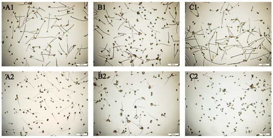 Pollen germination is the key factor affecting the pollination, fertilisation, and fruit-setting rate of C. oleifera. Drought stress significantly reduced the pollen germination rate of C. oleifera (Table 2); 15, 30, and 45 days of drought stress treatment significantly decreased the pollen germination rate by 35.78% (Figure 4(A1,A2)), 47.2% (Figure 4(B1,B2)), and 61.07% (Figure 4(C1,C2)) compared with the control group, respectively (p < 0.05). The pollen germination rate also decreased significantly under drought stress with the prolongation of treatment (p < 0.05). These results indicate that drought stress significantly inhibits pollen development in C. oleifera and that pollen germination rate decreases as treatment duration increases.
