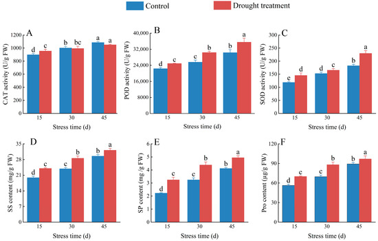 Effects of drought stress on catalase (CAT) (A), peroxidase (POD) (B), and superoxide dismutase (SOD) (C), activity and soluble sugar (SS) (D), soluble protein (SP) (E), and proline (Pro) (F), content in C. oleifera. Bars indicate standard error. Different letters indicate significant differences among groups (p < 0.05).