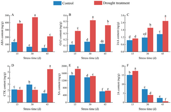 Effects of drought treatment on abscisic acid (ABA) (A), gibberellin (GA3) (B), indole acetic acid (IAA) (C), cytokinin (CTK) (D), salicylic acid (SA) (E), and jasmonic acid (JA) (F) content in C. oleifera pistils and stamens. Bars indicate standard error. Different letters indicate significant differences among groups (p < 0.05).