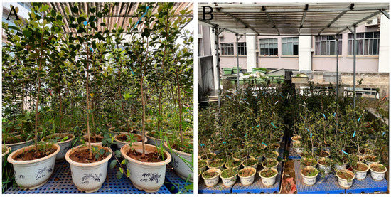 Experimental site conditions. (A) the 4-year-old C. oleifera potted dwarf plants were under identical water and fertiliser management conditions on the roof; (B) a canopy was built to prevent external environmental interference, and the potted dwarf plants were placed on a high of 15 cm bracket.f 15 cm.