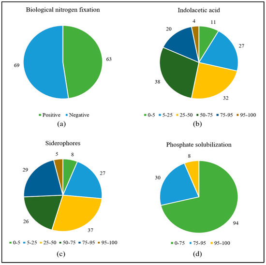Number of pangolão grass endophytic bacteria positive for growth in N-free media (a) or presenting given percentiles of IAA synthesis (b), siderophore production (c), and calcium phosphate solubilization (d).