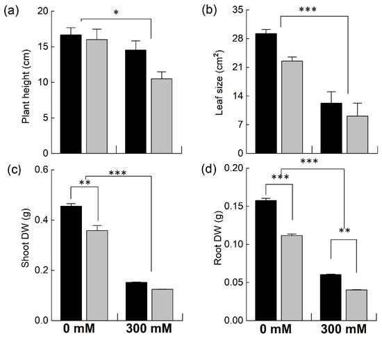 Comparison of different growth attributes of Brassica species under NaCl stress. Five-week-old plants of Brassica juncea (black bars) and Brassica napus (grey bars) were exposed to either 0 or 300 mM NaCl. Different growth parameters, such as plant height (a), leaf area (b), shoot dry weight (c), and root dry weight (d), were determined after 15 days of the treatment. Data points represent the means ± SD of three biological replicates. Significant differences are shown with different asterisks (***, **, * at p = 0.001, 0.01, 0.05, respectively).