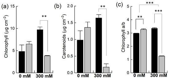 Effect of NaCl stress on different photosynthetic pigments. Plants of Brassica juncea (black bars) and Brassica napus (grey bars) were exposed to either 0 or 300 mM NaCl and concentrations of different photosynthetic pigments, including chlorophyll (a) and carotenoids (b), and the ratio of chlorophyll a/b (c) was measured after 15 days. Data points represent the means ± SD of three biological replicates. Significant differences are shown with different asterisks (***, ** at p = 0.001, 0.01, respectively).