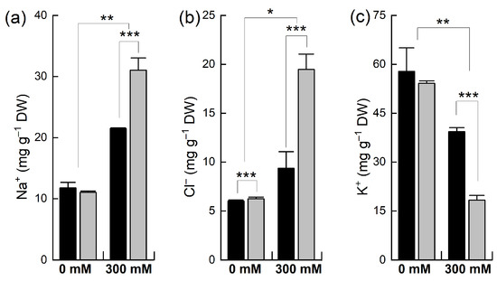 Accumulation of different ions in the leaves of Brassica plants under NaCl stress. Five-week-old plants of Brassica juncea (black bars) and Brassica napus (grey bars) were exposed to either 0 or 300 mM NaCl and concentrations of different ions, Na+ (a), Cl− (b), and K+ (c), were measured after 15 days, as described in the methods. Data points represent the means ± SD of three biological replicates. Statistically significant differences are shown with different asterisks (***, **, * at p = 0.001, 0.01, 0.05, respectively).