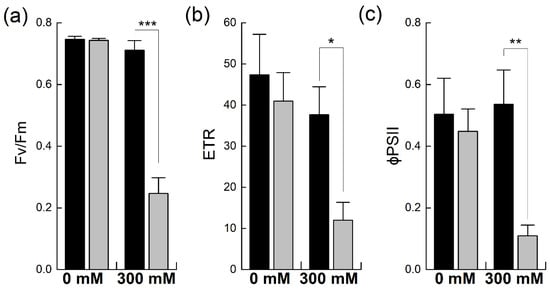 Chlorophyll fluorescence analysis is a well-established method used to estimate functional changes in photosynthesis [24]. It provides detailed information about PSII efficiency in intact leaves under different environmental conditions [25]. Chlorophyll fluorescence was probed to evaluate the efficiency and fluorescence quenching of PSII, including both the photochemical and non-photochemical forms, in B. napus and B. juncea with and without salt stress (Figure 4). The maximum quantum efficiency of PSII photochemistry, Fv/Fm, was comparable in the two species under non-stress conditions. However, exposure to 300 mM NaCl significantly reduced PSII quantum efficiency in B. napus (−66%), indicating the salt-induced photoinhibition of PSII due to stress. In contrast, the salt treatment did not significantly affect the Fv/Fm levels in B. juncea (Figure 4a). Due to photoinhibition, a reduction in the rate of electron transportation (ETR) was observed in both Brassicas. However, B. napus showed a much higher reduction in this parameter (−70% of control) than B. juncea, which showed only a mild reduction in ETR, confirming the stress-induced photoinhibition of PSII in B. napus (Figure 4b). Likewise, the effective quantum yield of PSII, as denoted by φPSII, was higher in B. juncea under control conditions. Exposure to NaCl stress reduced the PSII quantum yields in both species; however, high NaCl exposure caused substantial PSII quantum yield losses in B. napus (−75%). In contrast, the PSII quantum yield in B. juncea did not fall below the control level, even after 300 mM NaCl stress; rather, an increase in this parameter was observed after the salt stress (Figure 4c).