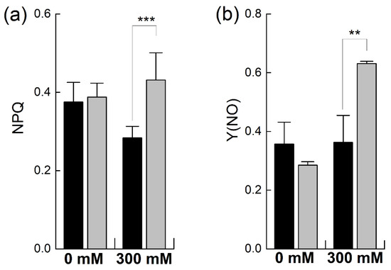 Effect of NaCl stress on non-photochemical PSII chlorophyll fluorescence in Brassica. Plants of Brassica juncea (black bars) and Brassica napus (grey bars) were exposed to either 0 or 300 mM NaCl and non-photochemical quenching of chlorophyll fluorescence was determined by recording regulated heat dissipation, NPQ (a), and nor-regulated energy dissipation, (Y(NO) (b). Data points represent the means ± SD of three biological replicates. Significant differences are shown with different asterisks (***, ** at p = 0.001 and 0.01, respectively).