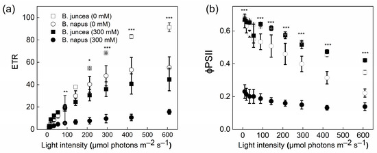 Electron transport rate and effective PSII efficiency in Brassica plants. Brassica juncea (black bars) and Brassica napus (grey bars) plants exposed to either 0 or 300 mM NaCl were used for the determination of the electron transport rate, ETR (a) and effective PSII efficiency, φPSII (b), in response to different light intensities at a CO2 partial pressure of 400 ppm. Data points represent the means ± SD of three biological replicates. Significant differences are shown with different asterisks (***, **, * at p = 0.001, 0.05 and 0.05, respectively).