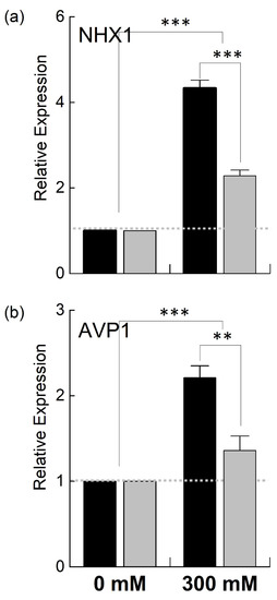 Relative expression of nuclear genes under salt stress. Fully expanded leaves of Brassica juncea (black bars) and Brassica napus (grey bars) plants exposed to either 0 or 300 mM NaCl were used for the determination of NHX1 (a) and AVP1 (b) expression levels. The dotted grey line represents the expression level of the genes in unstressed plants. Data points represent the means ± SD of three biological replicates. Statistically significant differences are shown with different asterisks (***, **, at p = 0.001, 0.01, respectively).