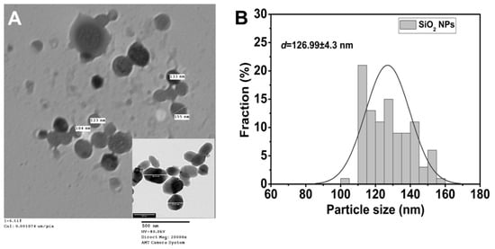 In this study, we described the creation of SiO2 nanoparticles using the sol–gel method and investigated their morphological structure using TEM. The results are displayed in Figure 2A,B. The TEM image and particle size distribution of the SiO2 nanoparticles produced under various sol–gel conditions are shown in Figure 2A. The homogeneous size distribution and spherical shape of the SiO2 nanoparticles can be seen in the image. Additionally, TEM analysis showed that the nanoparticles had negligible agglomeration. The particle size range was determined to be approximately ~126 nm in Figure 2B, which virtually indicated a tight size distribution [40,41]. Therefore, the optical and structural properties of SiO2 nanoparticles can be tailored by using synthesis process parameters for the plant stress application.