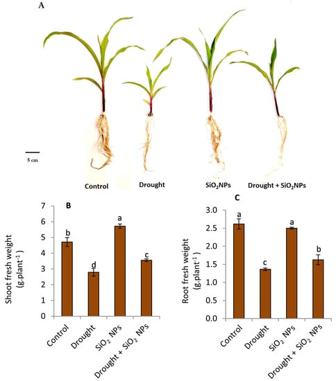 The most serious abiotic stress on crops is drought, which is brought on by insufficient rainfall and/or irregular precipitation patterns. The role of Si in improving vegetative growth has been reported in previous works such as that of Gong et al. [42] on wheat and that of Shen et al. [43] on soybean. Also, our results indicate that SiO2NPs improved shoot fresh weight under stress conditions or normal conditions (Figure 3B). In accordance with our results in Figure 3C, previous works reported the enhancement of root growth and weight by SiO2 application in Sorghum under drought stress [44,45]. This result could be due to the role of SiO2 in promoting water uptake under drought stress by controlling osmotic adjustment and modifying the expression proteins controlling the water channel [46]. In addition, the role of Si in increasing root length to recover from water stress was reported [47]. The role of SiO2NPs in improving the shoot and root growth of maize seedlings may be due to the role of Si in stimulating the process of photosynthesis, which leads to an increase in growth [48] or decreasing stomatal transpiration [49]. Also, Si treatment under drought stress could increase the fresh weight of maize seedlings by increasing water and osmotic potential and maintaining higher turgor pressure in plants [50].