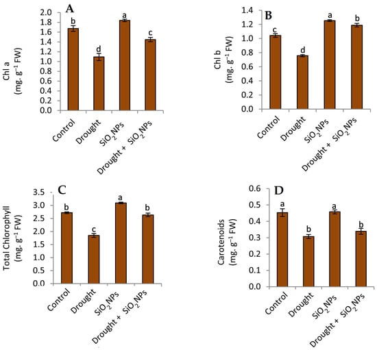 The results in Figure 4 indicate that the content of photosynthesis pigments in the maize seedlings was higher in the control treatment (non-water stress) compared with the drought stress condition. In addition, the treatment of maize seedlings with SiO2NPs has led to a significant increase in all previous compounds (except carotenoids) compared to seedlings that have not been treated. Under conditions of water stress, the application of SiO2NPs resulted in a noteworthy augmentation of chlorophyll a, chlorophyll b, and total chlorophyll in maize seedlings (Figure 4A–C). The study found that there was no statistically significant disparity in the carotenoid composition of seedlings subjected to SiO2NPs treatment and those that were not treated (as illustrated in Figure 4D), in the presence of water stress conditions. Reduced photosynthesis is one of the main effects of drought, which results from decreased leaf growth, damaged photosynthetic machinery, early leaf senescence, and a corresponding decline in food production [51]. This study confirms that drought stress reduces photosynthetic pigments (Figure 4A–D). This result could be due to stomatal and non-stomatal photosynthetic limitations under drought stress conditions [52]. Epstein [31] has reported an elevation in the enzymatic activity responsible for chlorophyll degradation, while Mafakheri et al. [53] have highlighted the adverse impact of ROS on chloroplast. Since chlorophyll content is positively correlated with the rate at which plants produce biomass through photosynthesis, it significantly determines plant productivity [54]. In harmony with our findings, Si treatment has been found to improve the photosynthetic rate under abiotic stress and increase chlorophyll pigments in wheat [44] and soybean [43]. It is well known that Si regulates the stomatal function and might affect photosynthetic efficacy by affecting the relations of gas exchange [55]. Also, Si application often enhances stomatal conductance (Kang et al., 2016) and leads to an increase in photosynthetic rates [56].