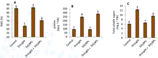 Effect of applied SiO2-NPs on (A) leaf relative water content, (B) proline, and (C) total soluble sugars of maize seedlings under normal irrigation and drought stress. The data that have been presented with a ±SD notation represent the mean values of three separate replicates. Significant variations were observed based on Duncan’s multiple range test at a significance level of p ≤ 0.05, as indicated by the distinct lowercase letters.